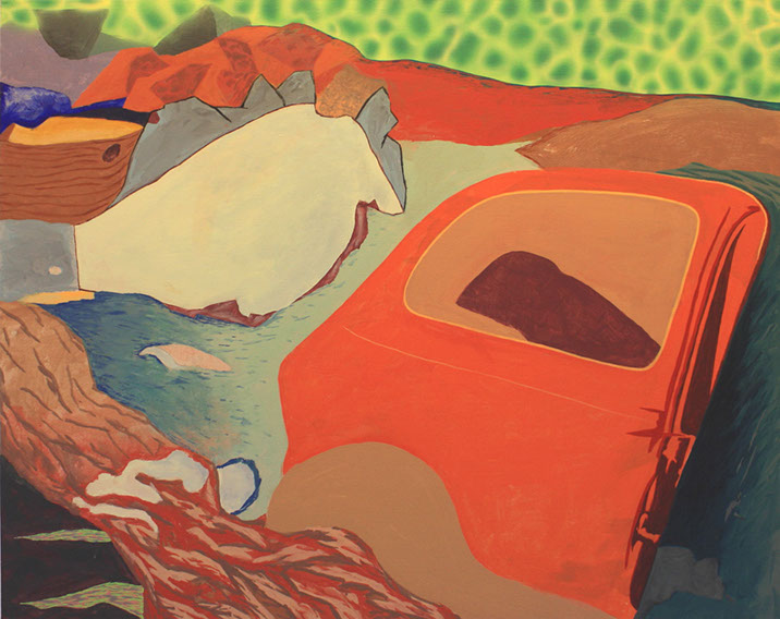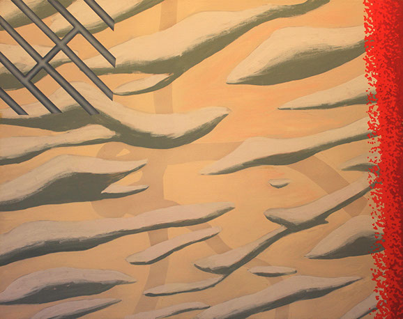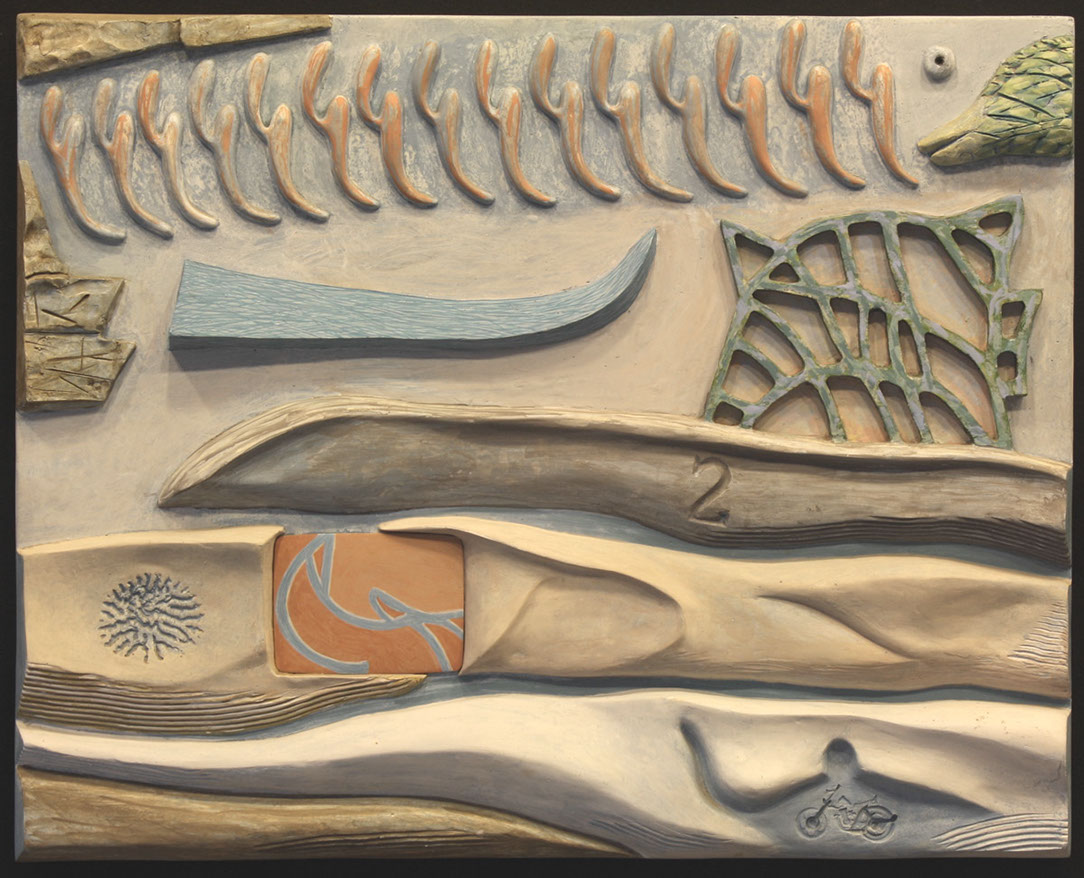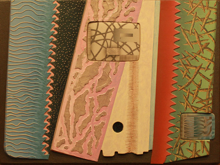 In the mid 90's, I began making low relief paintings, initially inspired by a vivid dream of mountainous textures of paint in relief with miniature TV screens embedded in the recesses. By spraying paint and squeegeeing molding paste through stencils onto the canvas, I was able to create a low relief painting of that vision, and then of others which followed. I continued to use imagery of the found object for the structural elements of these low relief paintings, keeping true to my vision of finding beauty in the ordinary, transforming the found object by abstraction.
