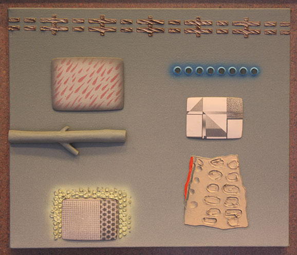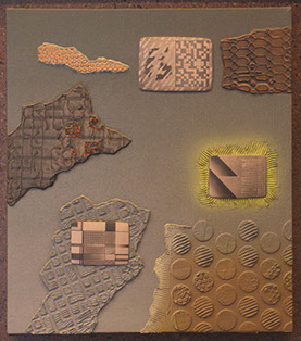 At a certain point I wanted higher relief than what I could get by using molding paste squeezed through stencils onto the canvas. By the end of the 90's I was using clay to make studies for higher relief pieces and was molding and casting the pieces, first in gypsum (design cast), and then in resin (aqua resin). I finished a piece by painting the final cast, using both brush and, sometimes, airbrush.