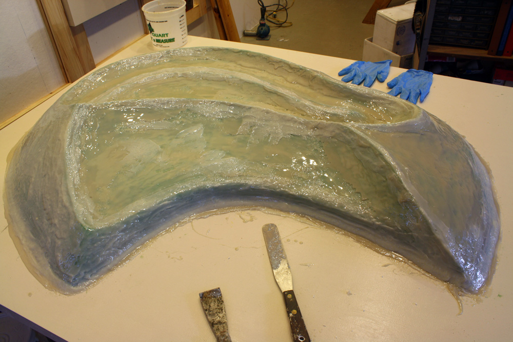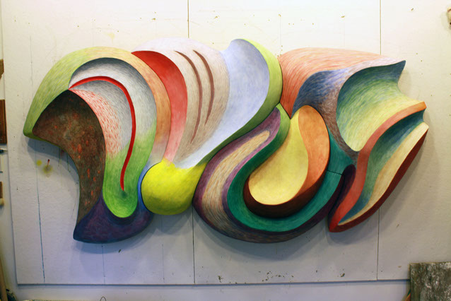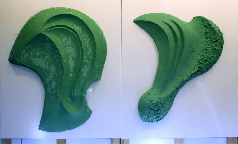 JAZZ, finished in early 2010, is the largest wall relief piece I have made so far. It took six months to complete and involved many different processes. I first made a small maquette of JAZZ, consisting of four separate sections each of which were cast in aqua resin. Using enlarged templates of each section as guides, I then made full size models in clay of the four sections entitled (viewing from left to right):